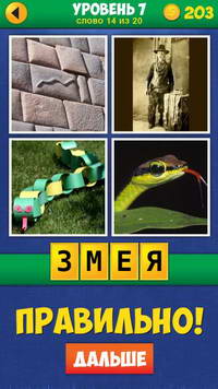 Вот мы с вами и перешагнули половину игры 4 фото 1 слово. На этот раз держите ответы на седьмой уровень 4 фото 1 слово: Еще Слова. Этот уровень, в отличие от предыдущего, имеет 20 заданий. В каждом из них вам необходимо будет найти слово, которое объединяет 4 фотографии. Это достаточно трудно, ведь правильным ответом в 4 фото 1 слово может оказаться не только существительное, но и прилагательное. А иногда даже глагол…