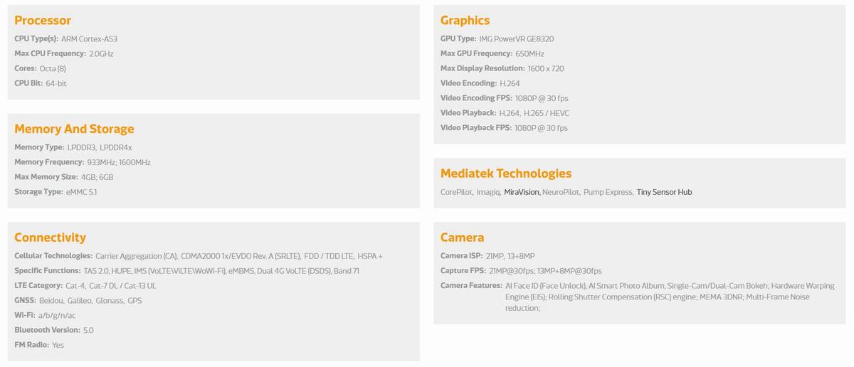 Что нам известно о данной мобильной платформе? Сообщается, что производством чипа занята тайваньская компания Taiwan Semiconductor Manufacturing Company, сокращенно TSMC. Также известно, что Helio P22 стал первым в мире бюджетным решением с очень тонким и современным техпроцессом в 12 нанометров, произведенным по технологии FinFET. Процессорный блок камня не поражает воображение, хотя от недорогого решения и глупо ожидать что-то иное, ведь в своем составе он имеет восемь вычислительных ядер Cortex-A53. Как и Snapdragon 625, у Helio P22 все восемь ядер трудятся на частоте до 2.0 ГГц и они не разделены на кластеры по технологии big.LITTLE.