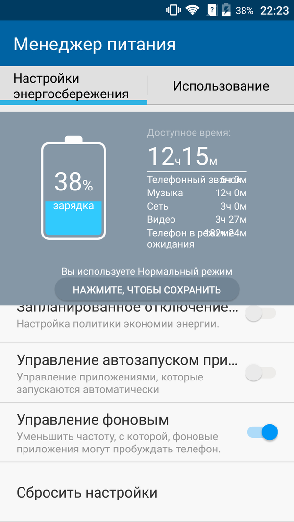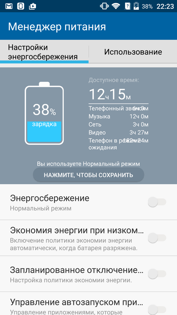 Сразу отметим, что с автономностью у Blade S7 дела плохи. В устройстве стоит аккумулятор на 2500 мАч и его продолжительную работу (если это можно так назвать) спасает только слабый процессор. Нет, Blade S7 выдержит день активной эксплуатации, но не более. Не спасает ситуацию и время зарядки - от 0 до 100% придется подождать целых 2,5 часа, что немало. Можно, конечно, немного продлить время работы смартфона за счет встроенной утилиты по энергосбережению, но существенно это не изменит ситуацию.
