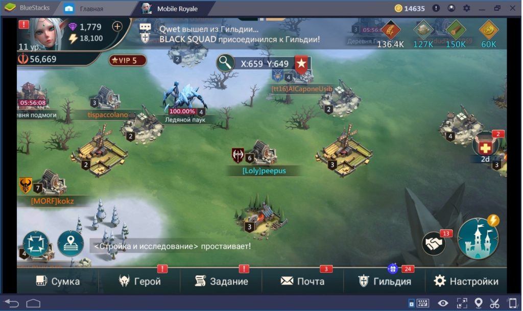 Mobile Royale – классическая ММО-стратегия, поэтому концепция и внегласные правила этой игры будут понятны практически любому мобильному геймеру. У вас есть город, который управляется вами. Сам замок/город расположен на большой карте мира, переплетаясь с вражескими селениями, управляемые другими геймерами. Вы вместе существуете в душном мире игры, сражаясь за золото, территорию и просто за опыт. Естественно, в Mobile Royale можно создавать Гильдии и объединяться в большие братства, усиливая влияние на тот сервер, на котором вы располагаетесь. В игре есть не только социальная составляющая, но и суровый мультиплеер, в котором вас ждут 50 миссий. Задания в них самые разнообразные: от «прокачай героя до пятого уровня» до «убей огромного паука в долине». roayale