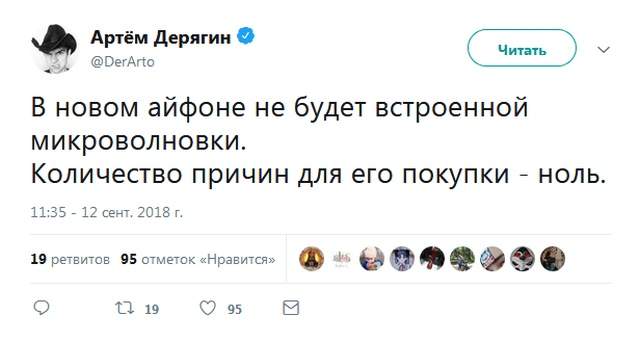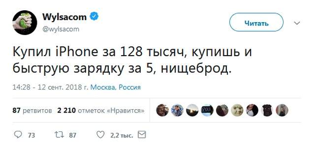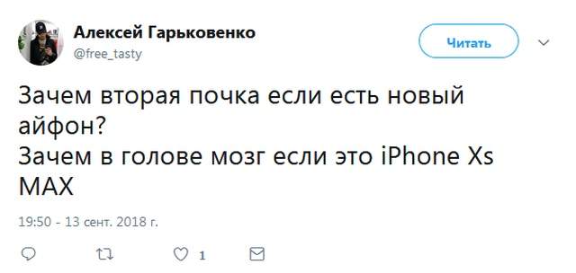 Вот и отшумела презентация Apple 12 сентября, новинки iPhone XS, XS Max и XR уже успели обозреть все, кому не лень, да и с цен новых iPhone 2018 смогли ужаснуться многие. А как тут не ужаснуться, если максимальная цена iPhone XS Max на 512 ГБ составила сумасшедшие 128000 рублей!!! За такие деньги не то чтобы 10 Redmi Note 5 в максимальной конфигурации можно купить, получится купить Mi Notebook, Xiaomi Mi 8 на максималках, браслет Mi Band 3 и еще на жвачку останется. Да вы и сами прекрасно понимаете и знаете, на что можно потратить столь большую сумму, поэтому в сети и расплодилось множество шуток на тему новинок от Apple. Народ у нас такой, не отчаивается, так что почему бы и не посмеяться? Честно говоря, шутки получились зачетными, так что не будем тянуть, а давайте посмотрим и почитаем то, какие мемы создали пользователи за 4 дня спустя после презентации Apple. Отличились даже и некоторые крупные блогеры, как например Wilsacom - известный всем любитель техники из Купертино.