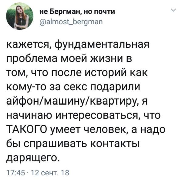 Классика, что с нее взять. Как обычно, шутят про девушек, у которых появились свежие модели iPhone? Все правильно, дел "по горло". Это хоть и смешно, но уж лучше так, чем жертвовать почкой, ведь горловому минету обучают и это никак не вредит здоровью... Может даже и полезно.